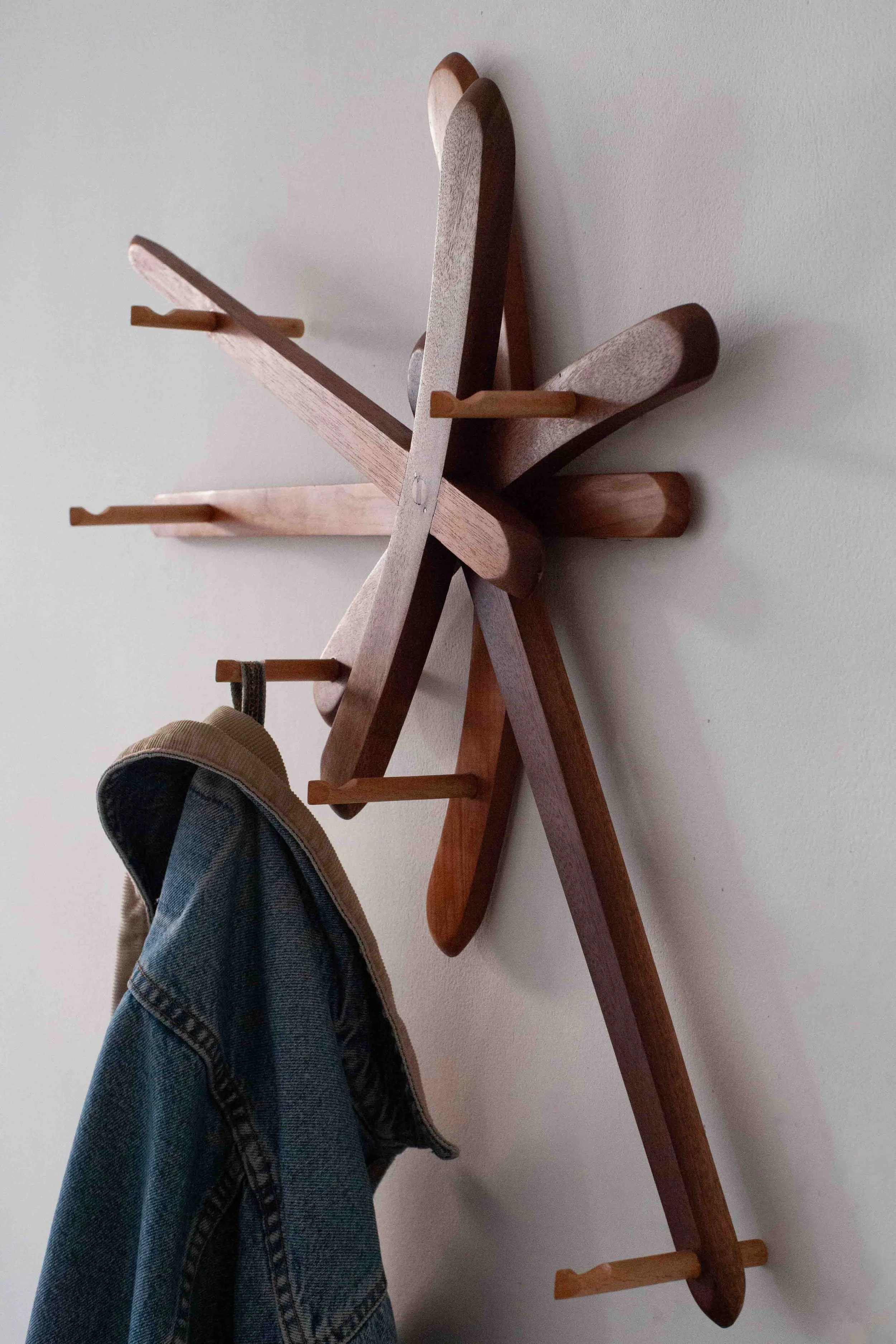 like the hands of a clock frozen in time, this one-of-a-kind wood coat rack is the perfect place to hang your jacket and let the hours just melt away.