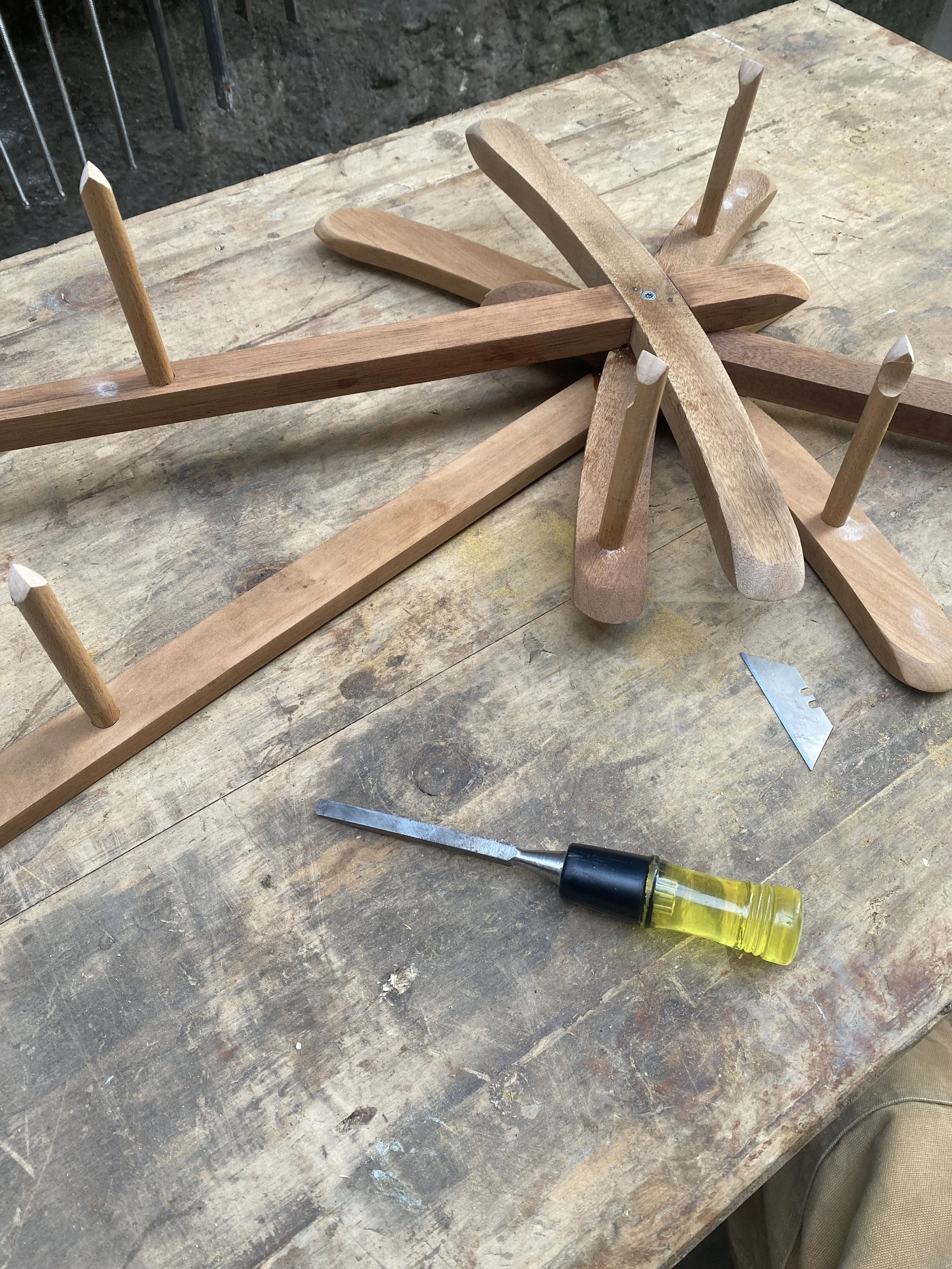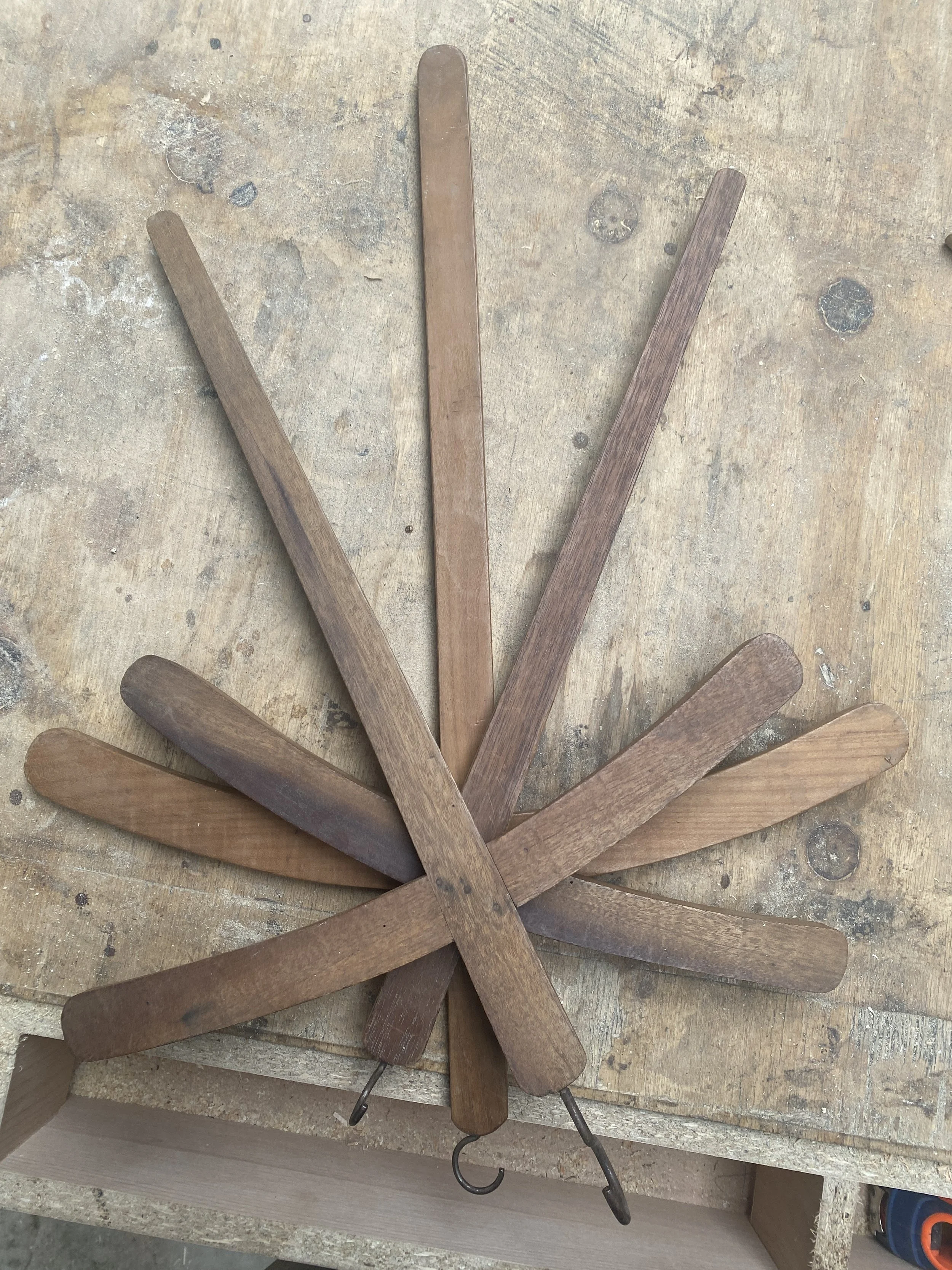 made from repurposed wood hangers pulled from the trash in porto and oak dowels. finished with shellac